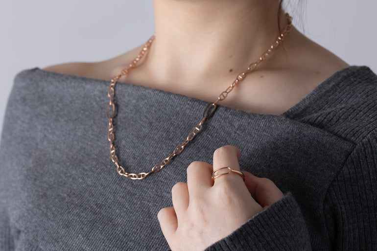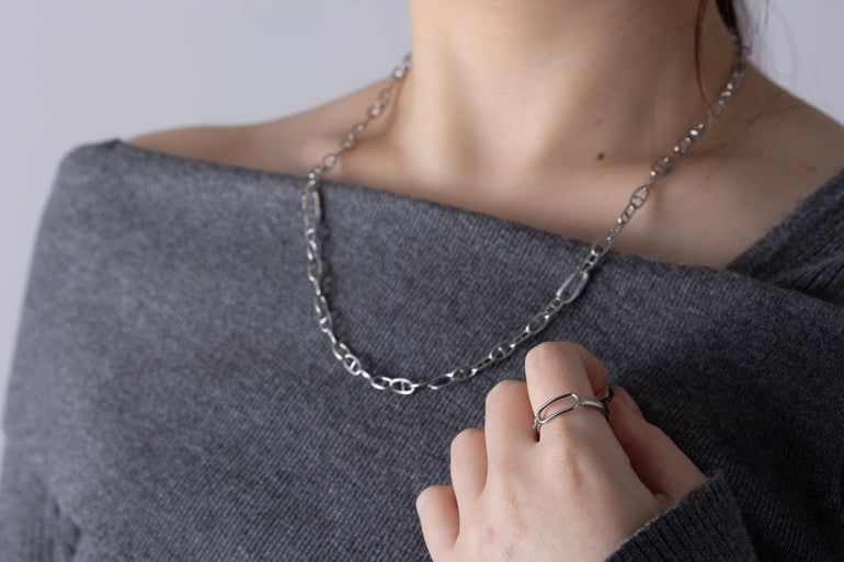 Eternal Loop is a collection of accessories that features a simple yet unique design, with the "Loop" symbolizing the eternal circle. It is available in two types, necklace and ring, and three colors: silver, rose gold, and black. The silver is especially platinum plated, combining high-quality shine and durability.