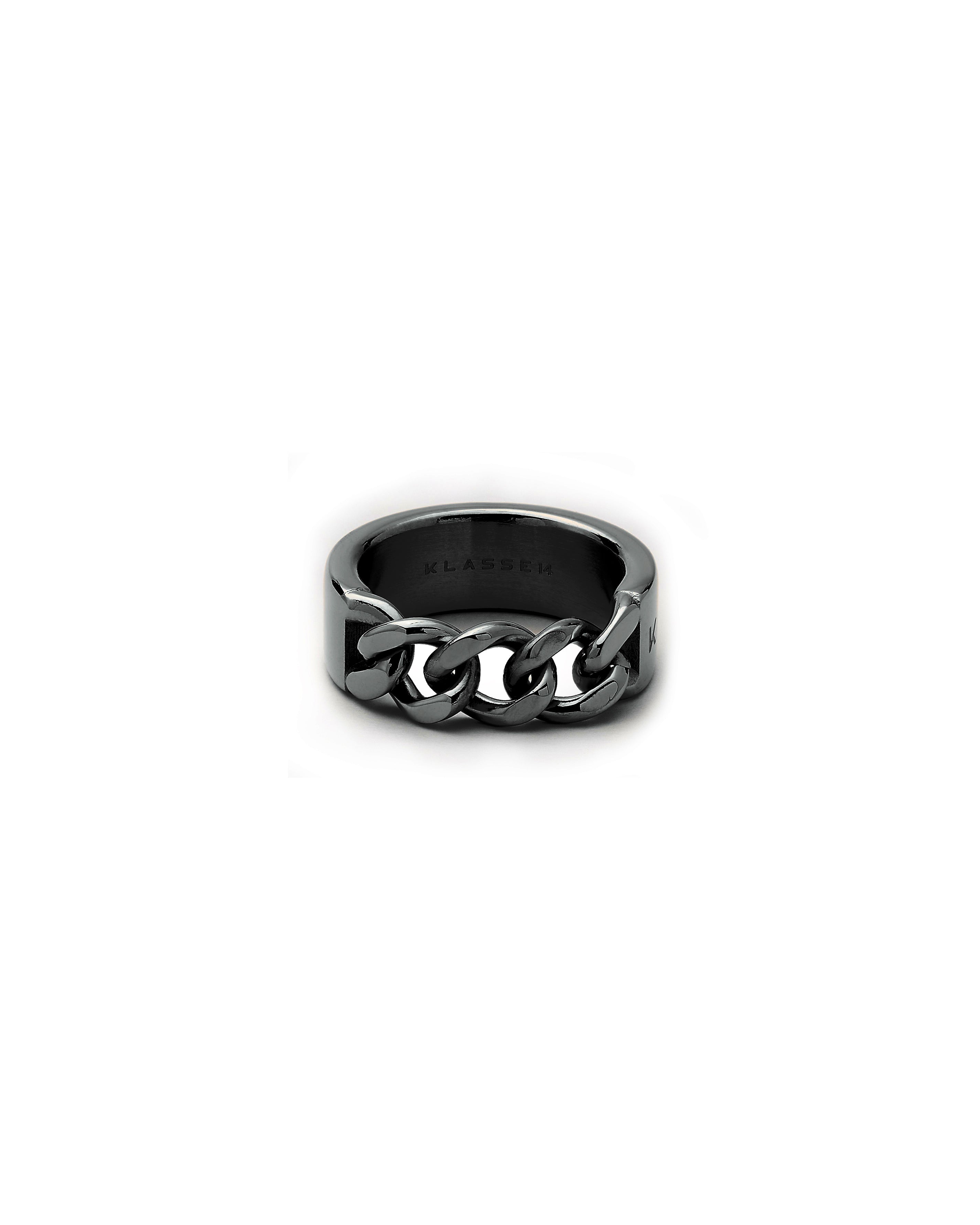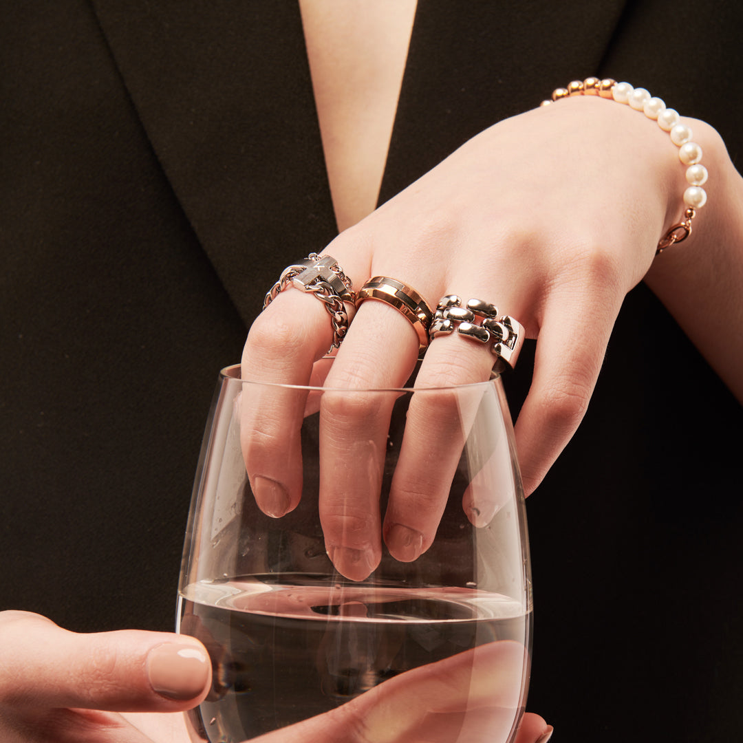 The Chained Ring is intricately designed to be composed of pure, solid metal, while breaking in the middle to feature chain-like metal. Its unconventional design defies boundaries. / Simple, yet striking. The Grinder Ring is a subtle statement piece in itself, drawing the attention to the cool grinder-like design surrounding the ring.