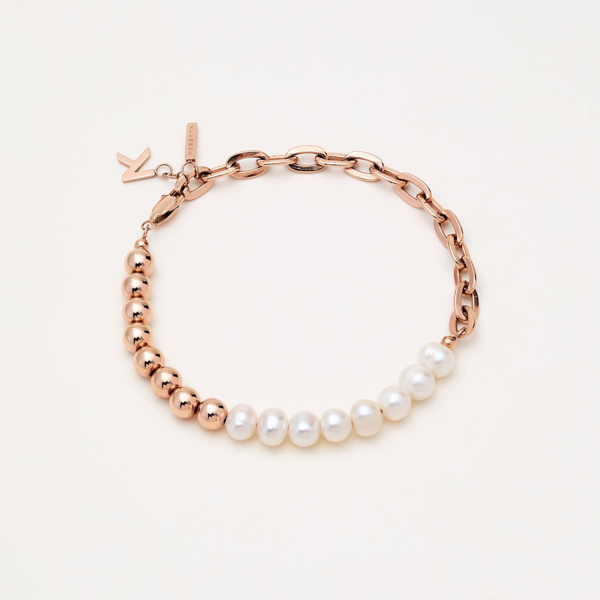 The Chain Sphere bracelet is a stylish balance between a metal chain, metal beads and pearl shell beads.